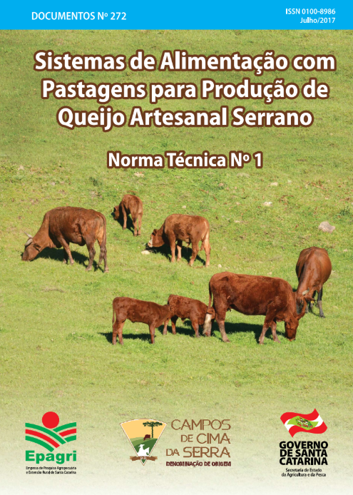CÓRDOVA, U. de A.; SCHLICHTING, A. P.; FERREIRA, E. N. R. C.; SOUZA, L. T. de; JESUS, N. N. de; NETO, S. P. Sistemas de Alimentação a Pasto para Produção de Queijo Artesanal Serrano - Norma Técnica Nº 1. Florianópolis: Epagri, 2017. 32p. (Epagri. Documentos, 272).