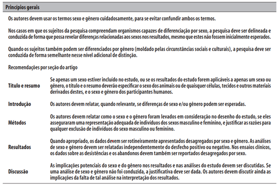 A RAC orienta e incentiva o uso da Sex and Gender Equity in Research – SAGER (Heidari et al., 2017) – para relatar informações sobre sexo e gênero no desenho do estudo, na análise de dados, nos resultados e na interpretação dos achados. Veja as orientações nas imagens 1 e 2.